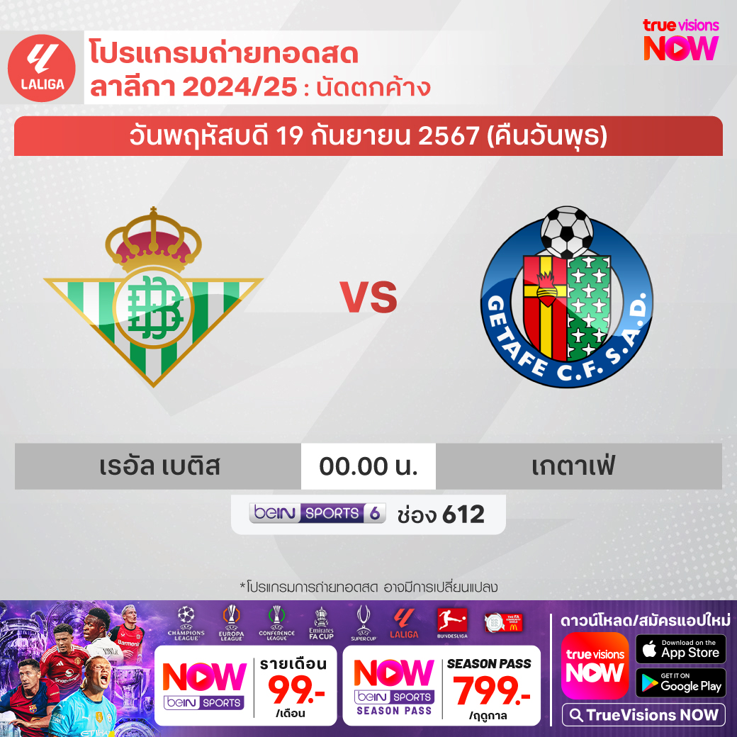 Real Betis vs Getafe เวลา 00.00-02.00 ทางช่อง beIN 6 (612)