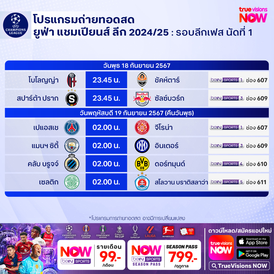 วันนี้มีอะไรดูที่ ทรูวิชั่นส์ ประจำวันพุธที่ 18 กันยายน 67 ยังคงมีกีฬาที่น่าสนใจให้ได้ตามลุ้นตามเชียร์กันเหมือนเดิม โดยในส่วนของฟุตบอลนั้น ยังมีศึก ยูฟ่า แชมเปี้ยนส์ ลีก รอบ ลีก เฟส และ ลา ลีกา สเปน ให้ได้ตามเชียร์กันต่อเนื่อง ส่วนกีฬาอื่นๆ ยังมีศึกเทนนิส เอทีพี ทัวร์ รายการ หางโจว โอเพ่น, ดับเบิ้ลยูทีเอ ทัวร์ รายการ ไทยแลนด์ โอเพ่น และ โคเรีย โอเพ่น นอกจากนี้ยังมีแบดมินตัน บีดับเบิ้ลยูเอฟ รายการ ไชน่า โอเพ่น และ เวิลด์ สนุกเกอร์ ทัวร์ รายการ อิงลิช โอเพ่น งานนี้ ทรูวิชั่นส์ จัดเต็มให้ชมกันถึงบ้าน