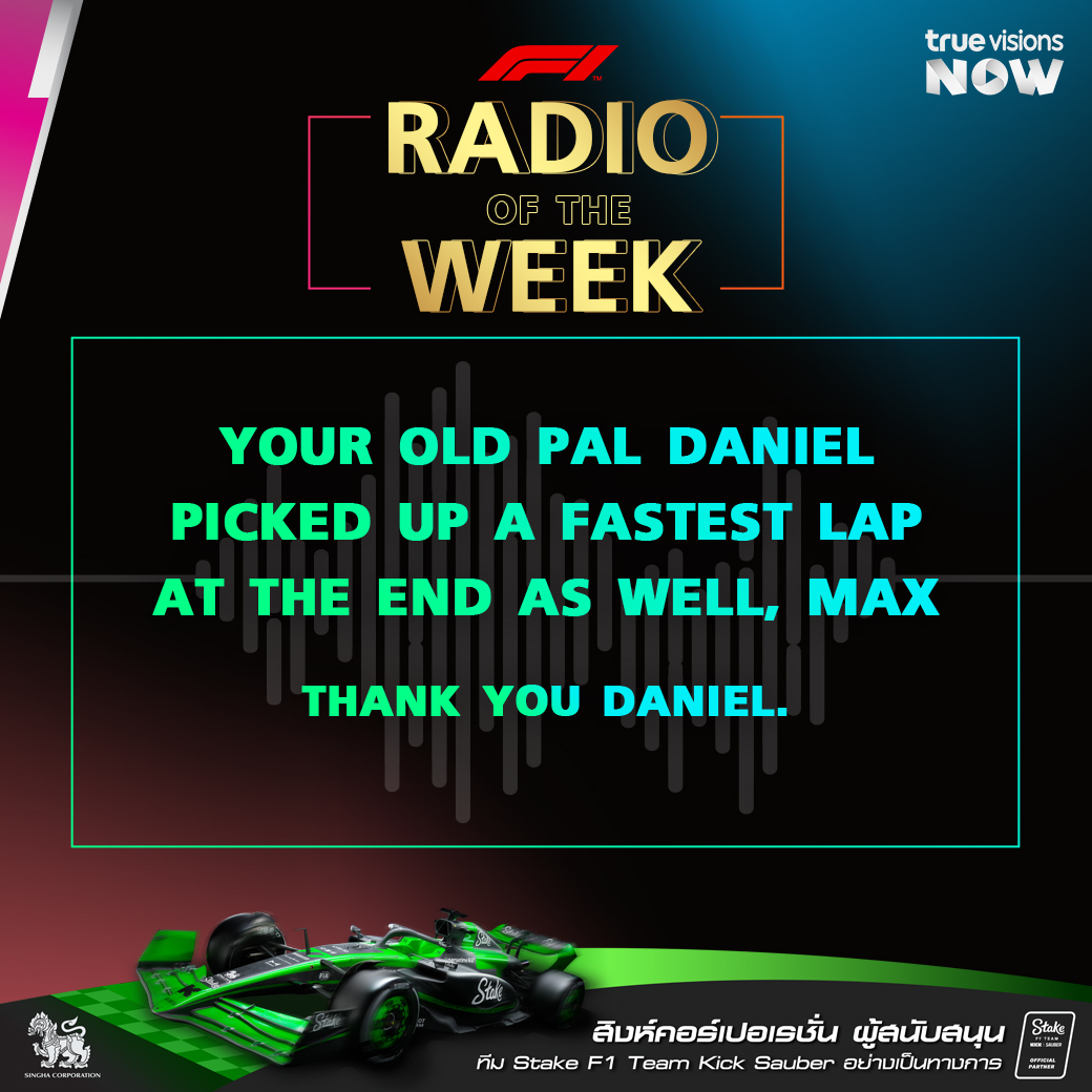 หลายต่อหลายคนอาจรู้สึกถึงบางอย่างเกี่ยวกับการขับของ ริคคาร์โด้ ที่อาจเป็นสนามสุดท้าย แม็กซ์ เวอร์สเตปเปน ก็อาจจะรู้มาบ้าง แต่คำขอบคุึณนั้นมาเพราะการขับเคี่ยวแย่งแชมป์หมายความว่าทุกคะแนนสำคัญ และ จานปิเอโร แลมเบียเซ่ วิศวกรส่วนตัวกำลังคุยเรื่องช่องว่างคะแนนว่างในสนามนี้จบด้วยอันดับ 2 เก็บได้น้อยกว่า ลันโด นอร์ริส 8 คะแนน และบอกว่าโบนัส 1 คะแนน นอร์ริส ไม่ได้ไป เพราะเพื่อนซี้คนเก่า แดเนี่ยล ทำได้ เวอร์สเตปเปน จึงลงท้ายเป็นคำขอบคุณ ที่อาจจะแฝงความหมายทั้งการขอบคุณที่ไม่ปล่อยให้คู่แข่งได้คะแนนเพิ่ม และขอบคุณสำหรับทุกอย่าง