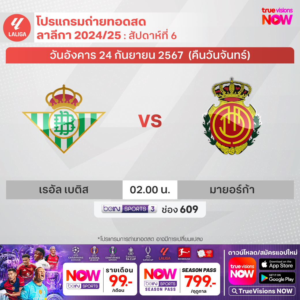 Real Betis vs Mallorca เวลา 02.00-04.00 ทางช่อง beIN 3 (609)