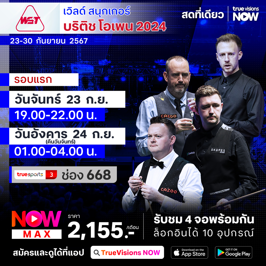 สนุกเกอร์เก็บคะแนนสะสมโลก เวิลด์ สนุกเกอร์ ทัวร์ ฤดูกาล 2024/25 สัปดาห์นี้ยังปักหลักกันในประเทศอังกฤษเป็นสัปดาห์ที่ 2 กับรายการ บริติช โอเพ่น 2024 ที่สุดยอดฝีมือและซูเปอร์สตาร์ของโลก มาร่วมการแข่งขันกันอย่างคับคั่ง ใครจะคว้าโทรฟี่แชมป์รายการนี้ไปครอง ชมสด เอ็กซ์คลูซีฟ ครบทุกรอบ ที่เดียวที่ ทรูวิชั่นส์