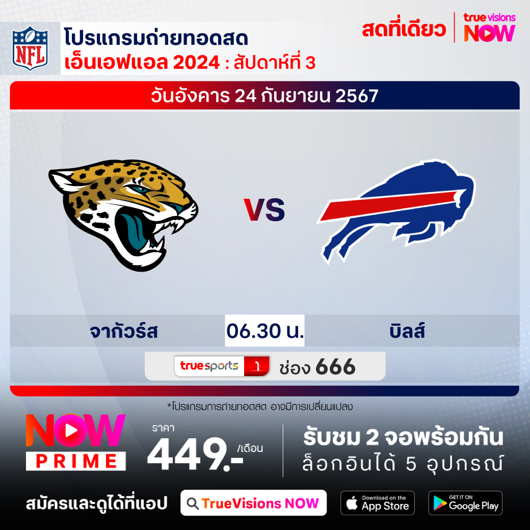 วันอังคาร 24 ก.ย. Jaguars Vs Bills เวลา 06.30 ทางช่อง TS 1 (666)