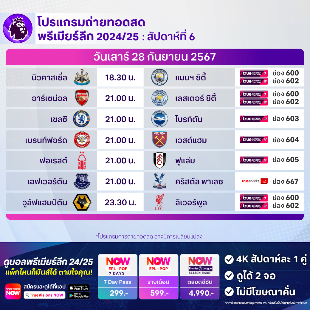 Newcastle vs Man City เวลา 18:30 - 20:30 ทางช่อง TPF 1 (600) / TPF 2 (602)