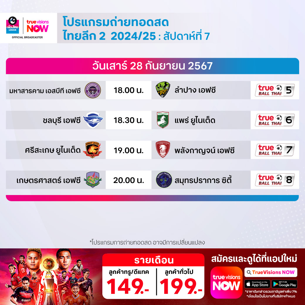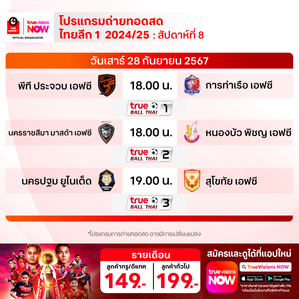 นครปฐม ยูไนเต็ด พบ สุโขทัย เอฟซี เวลา 19.00-21.00 ทางช่อง True Ball Thai 3