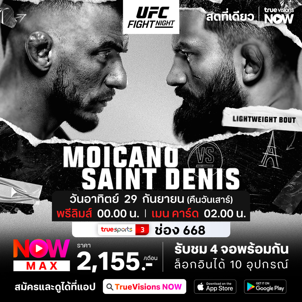 ศึกยูเอฟซี ไฟต์ ไนท์ สั่งลาเดือนกันยายนกับความมันส์ที่ส่งตรงจากแดนน้ำหอม ประเทศฝรั่งเศส สัปดาห์นี้ คู่เอกของรายการรุ่นไลต์เวต เฮนาโต้ มอยคาโน่ รองแชมป์อันดับ 1 จากบราซิล ปะทะนักสู้ฝรั่งเศส บีนัวร์ แซ็งต์ เดนีส์ ชมสด เอ็กซ์คลูซีฟ จาก แอ็คคอร์ อารีน่า กรุงปารีส ที่เดียว ที่ ทรูวิชั่นส์