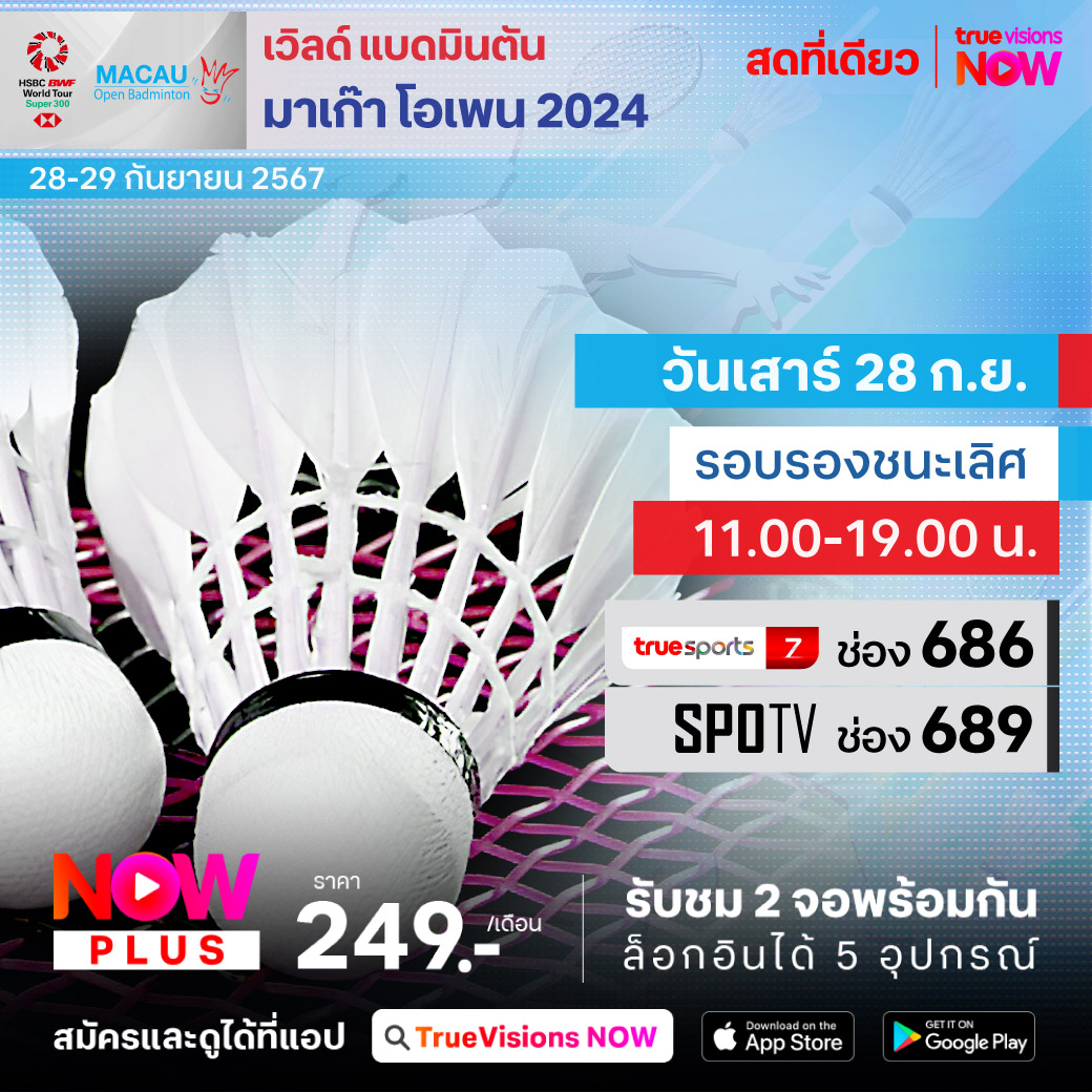 เวิลด์ แบดมินตัน เก็บคะแนนสะสมโลก ยังคงเดินหน้าไล่ล่าแชมป์กันในทวีปเอเชียต่อในรายการ มาเก๊า โอเพ่น รายการ ระดับ เวิลด์ ทัวร์ ซูเปอร์ 300 ร่วมเชียร์ทีมแบดมินตันไทย ตบเพื่อคว้าชัยชนะเหนือคู่แข่งจากนานาชาติ ชมสด เอ็กซ์คลูซีฟ ที่เดียว ที่ ทรูวิชั่นส์