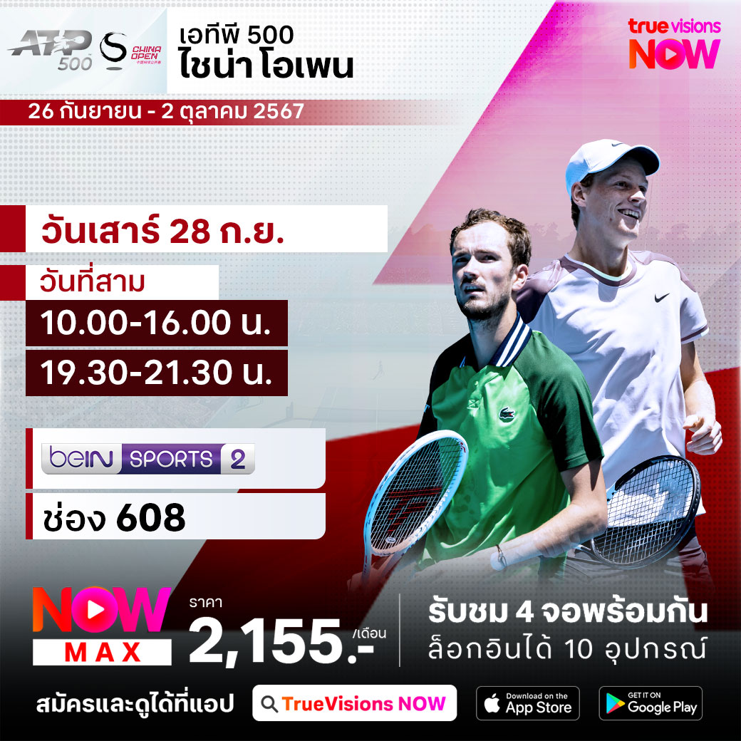 การแข่งขันเทนนิสชาย เอทีพี ทัวร์ รายการใหญ่ ไชน่า โอเพ่น ถ่ายทอดสดจากกรุงปักกิ่ง ประเทศสาธารณรัฐประชาชนจีน ผู้เล่นชื่อดังระดับโลกเข้าร่วมการแข่งขันคับคั่ง ร่วมลุ้นกันว่าใครจะคว้าแชมป์รายการนี้ไปครองได้สำเร็จ ชมสด ครบทุกรอบ ที่ ทรูวิชั่นส์