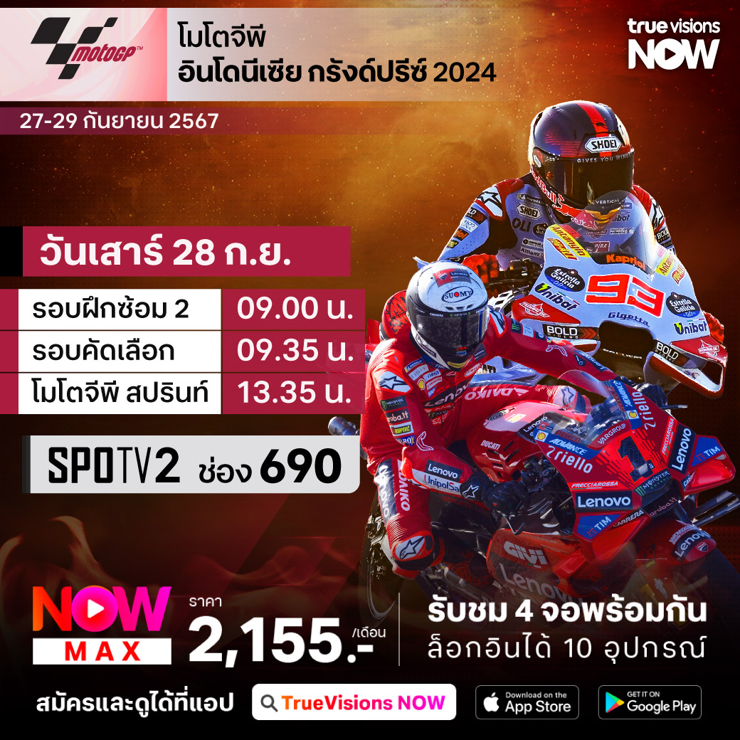 ศึกโมโต จีพี เวิลด์ แชมเปี้ยนชิพ สัปดาห์นี้ สุดยอดนักบิดชั้นนำของโลกทั้ง 3 รุ่นมานัดดวลกันที่แดนอิเหนา อินโดนีเซีย กับ รายการ อินโดนีเซีย กรังด์ปรีซ์ ที่สนาม เพอร์ตามิน่า มันดาลิกา เซอร์กิต ที่สุดท้าทาย ร่วมส่งใจเชียร์ ก้อง สมเกียรติ จันทรา หนึ่งเดียวของไทยในรุ่นโมโต 2 และ ลุ้นสุดตัวกับความมันส์จากรุ่น โมโต จีพี ที่กำลังเข้มข้นดุเดือด กับการชิงตำแหน่งบนโพเดี้ยม ชมสด ครบทุกช่วง ที่ ทรูวิชั่นส์