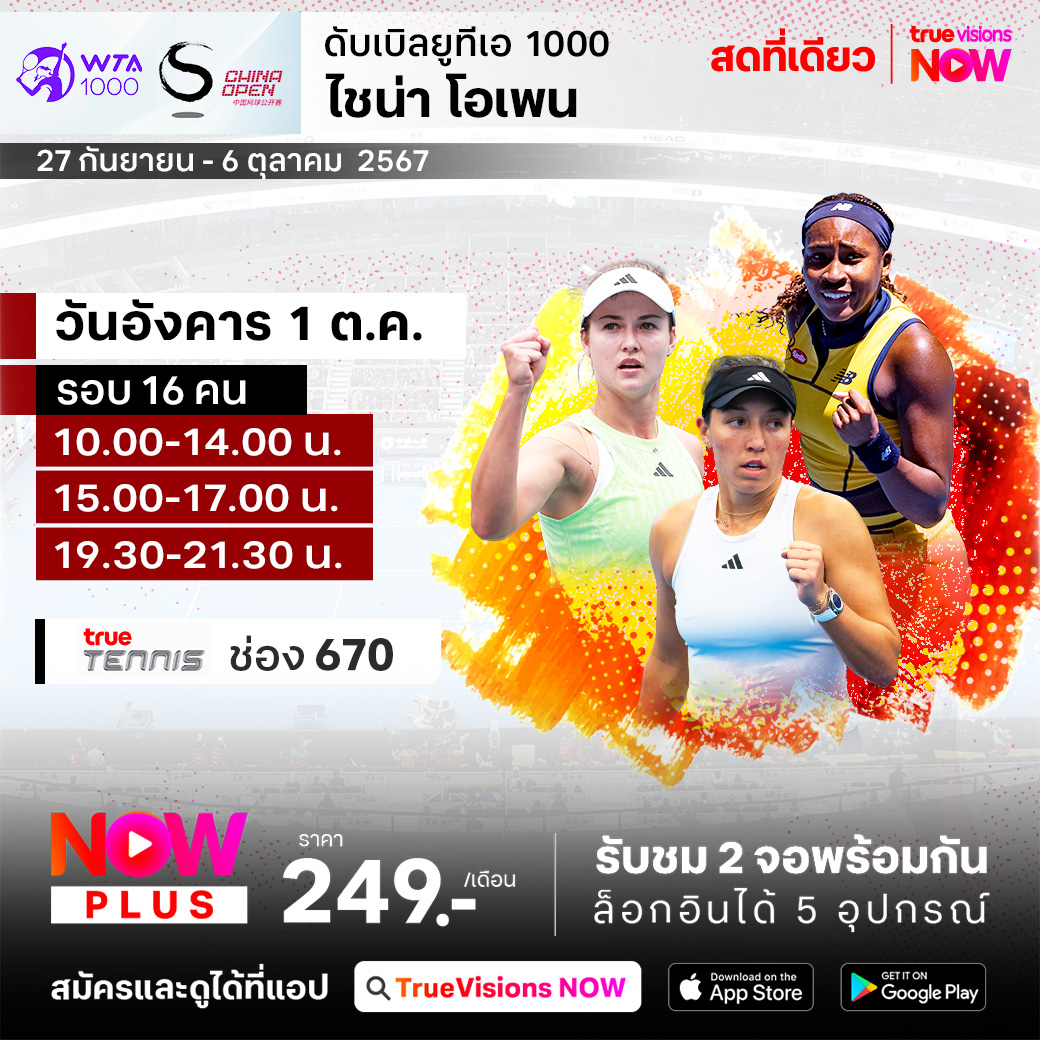 แฟนเทนนิสหญิง ดับเบิ้ลยูทีเอ ทัวร์ สัปดาห์นี้พบกับรายการ ไชน่า โอเพ่น ถ่ายทอดสดจากกรุงปักกิ่ง ประเทศสาธารณรัฐประชาชนจีน ผู้เล่นชื่อดังระดับโลกเข้าร่วมการแข่งขันคับคั่ง ร่วมลุ้นว่าใครจะคว้าแชมป์เทนนิสรายการใหญ่ที่สุดในทวีปเอเชียไปครองได้สำเร็จ ชมสด ครบทุกรอบ ที่ ทรูวิชั่นส์