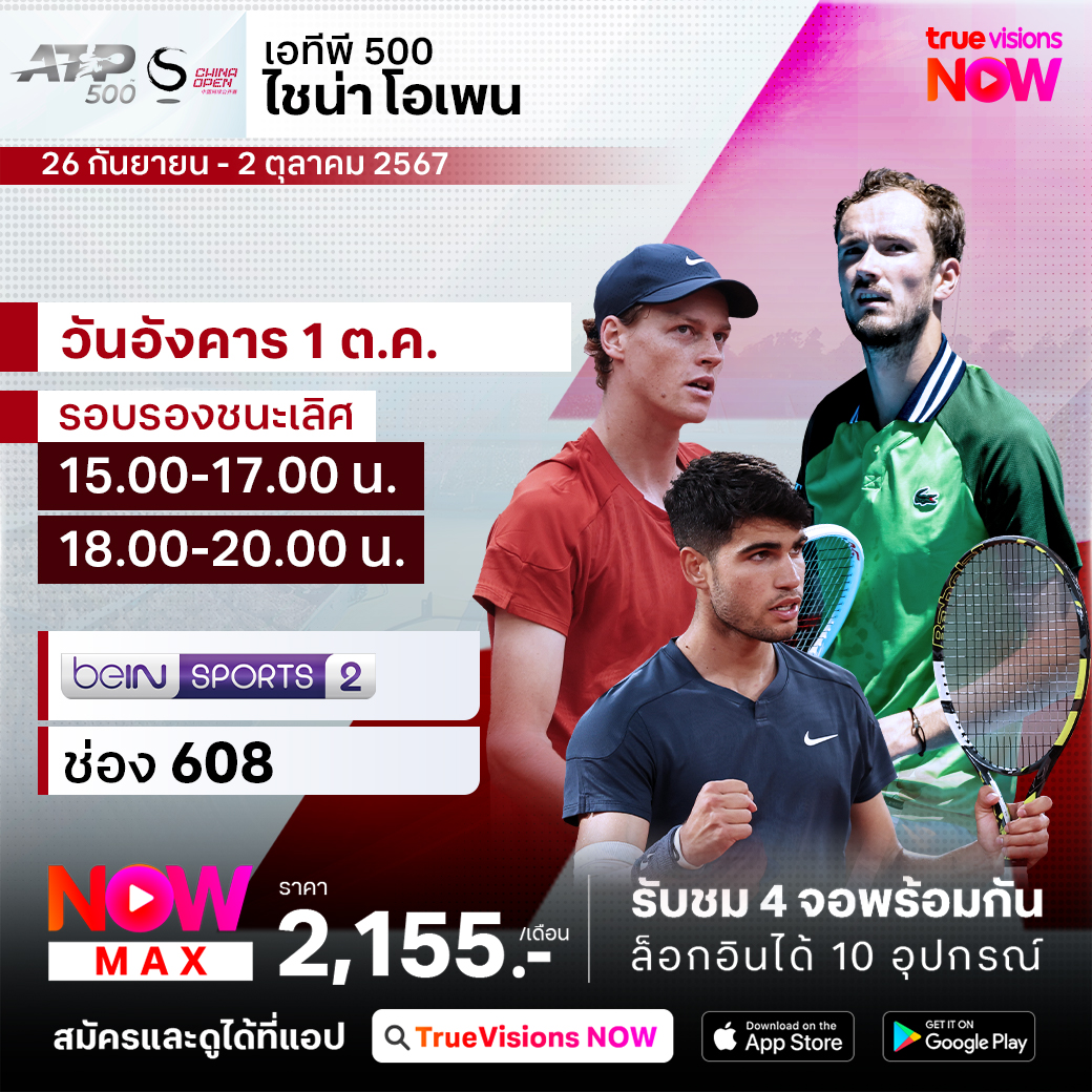 การแข่งขันเทนนิสชาย เอทีพี ทัวร์ รายการใหญ่ ไชน่า โอเพ่น ถ่ายทอดสดจากกรุงปักกิ่ง ประเทศสาธารณรัฐประชาชนจีน ผู้เล่นชื่อดังระดับโลกเข้าร่วมการแข่งขันคับคั่ง ร่วมลุ้นกันว่าใครจะคว้าแชมป์รายการนี้ไปครองได้สำเร็จ ชมสด ครบทุกรอบ ที่ ทรูวิชั่นส์