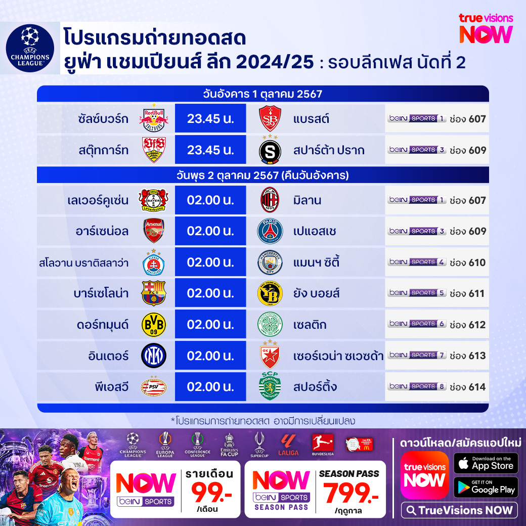 วันนี้มีอะไรดูที่ ทรูวิชั่นส์ ประจำวันอังคารที่ 1 ตุลาคม 67 ยังคงมีกีฬาที่น่าสนใจให้ได้ตามลุ้นตามเชียร์กันเหมือนเดิม โดยในส่วนของฟุตบอลนั้น ยังมีศึก ยูฟ่า แชมเปี้ยนส์ ลีก รอบ ลีก เฟส นัดที่สอง ให้ได้ตามเชียร์กันต่อเนื่อง ส่วนกีฬาอื่นๆ ยังมีศึกเทนนิส เอทีพี ทัวร์ และดับเบิ้่ลยูทีเอ ทัวร์ รายการ ไชน่า โอเพ่น ให้ได้ลุ้นกัน งานนี้ ทรูวิชั่นส์ จัดเต็มให้ชมกันถึงบ้าน