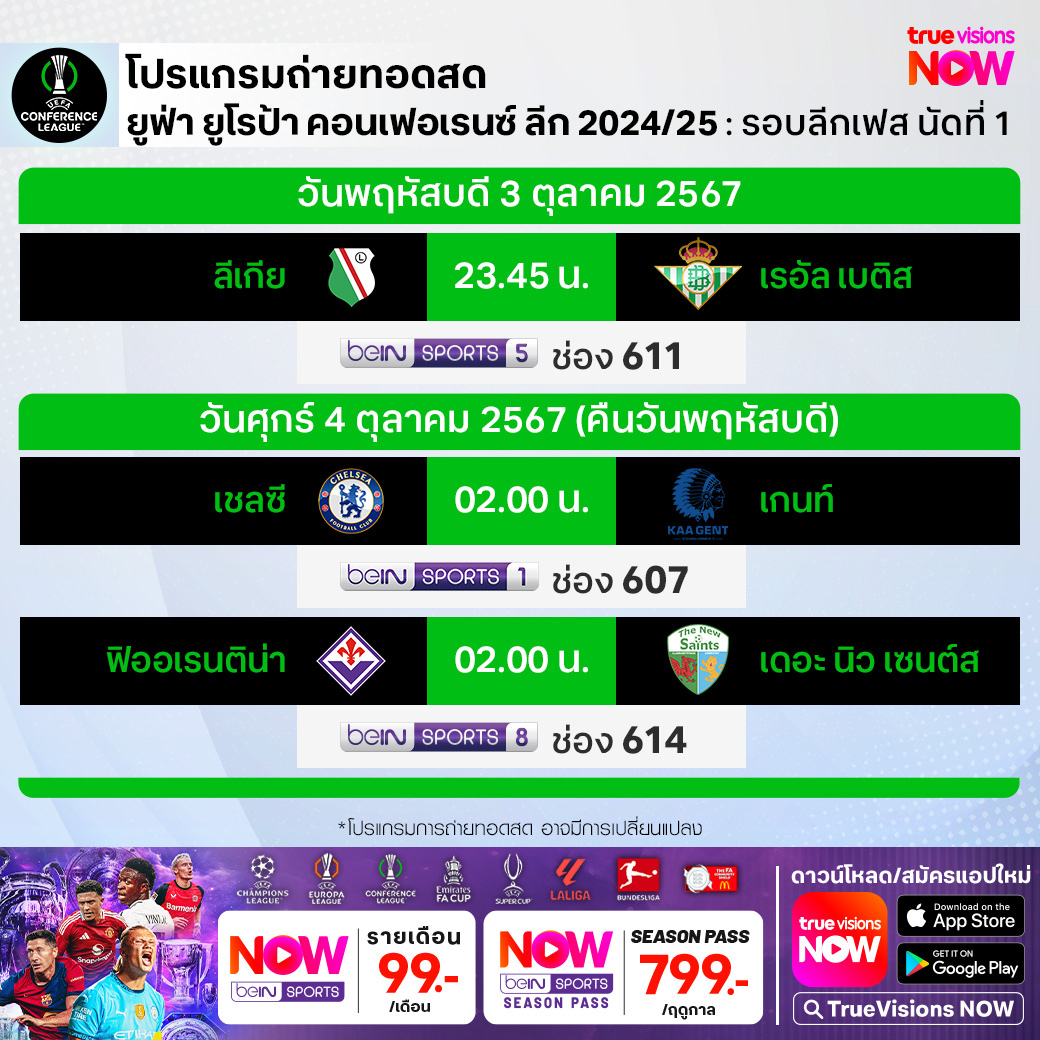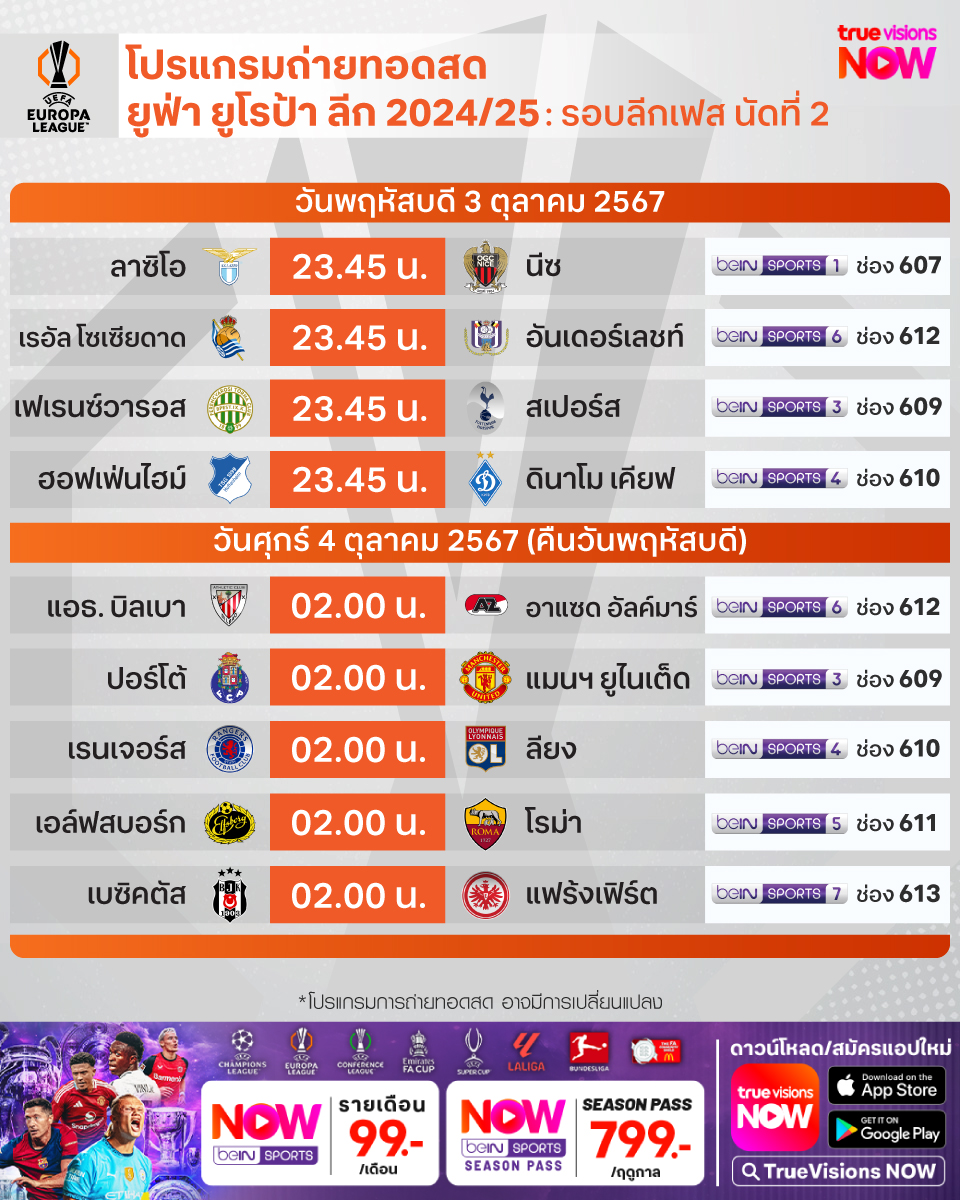 วันนี้มีอะไรดูที่ ทรูวิชั่นส์ ประจำวันพฤหัสบดีที่ 3 ตุลาคม 67 ยังคงมีกีฬาที่น่าสนใจให้ได้ตามลุ้นตามเชียร์กันเหมือนเดิม โดยในส่วนของฟุตบอลนั้น ยังมีศึก ยูฟ่า ยูโรป้า ลีก และ ยูฟ่า คอนเฟอเรนซ์ ลีก รอบ ลีก เฟส ให้ได้ตามเชียร์กันต่อเนื่อง รวมถึงฟุตบอล ซาอุดิ โปร ลีก ส่วนกีฬาอื่นๆ ยังมีศึกเทนนิส เอทีพี ทัวร์ รายการ เซี่ยงไฮ้ มาสเตอร์ส และดับเบิ้่ลยูทีเอ ทัวร์ รายการ ไชน่า โอเพ่น ให้ได้ลุ้นกันต่อ นอกจากนี้ยังมีกอล์ฟ พีจีเอ ทัวร์ รายการ แซนเดอร์สัน ฟาร์มส์ แชมเปี้ยนชิพ, ดีพี เวิลด์ ทัวร์ รายการ อัลเฟร็ด ดันฮิลล์ ลิงค์ส แชมเปี้ยนชิพ รวมถึงศึกอเมริกันฟุตบอลเอ็นเอฟแอล งานนี้ ทรูวิชั่นส์ จัดเต็มให้ชมกันถึงบ้าน
