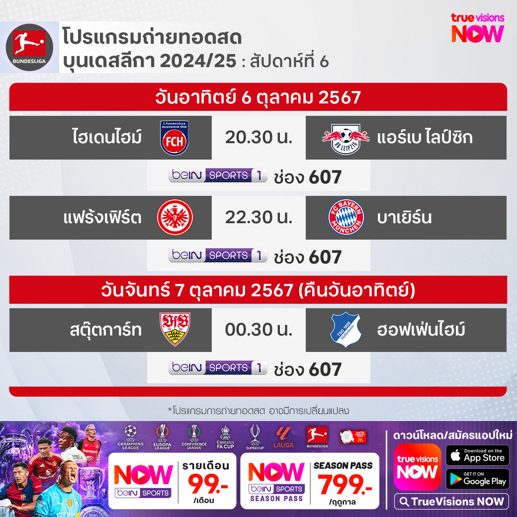 Frankfurt vs Bayern เวลา 22.30-00.30 ทางช่อง beIN 1 (607)