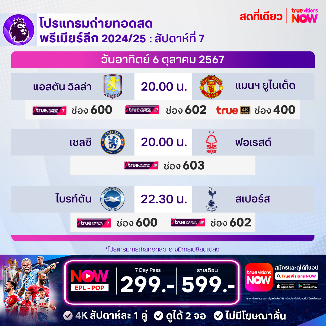 Aston Villa vs Man Utd เวลา 20:00 - 22:00 ทางช่อง TPF 1 (600) / TPF 2 (602) / 4K (400)