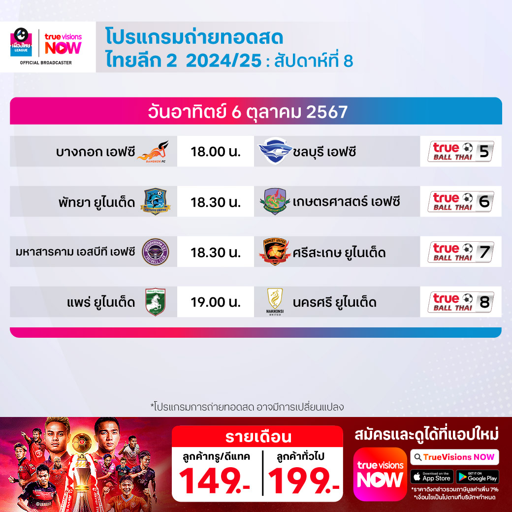 แพร่ ยูไนเต็ด พบ นครศรี ยูไนเต็ด เวลา 19.00-21.00 ทางช่อง True Ball Thai 8