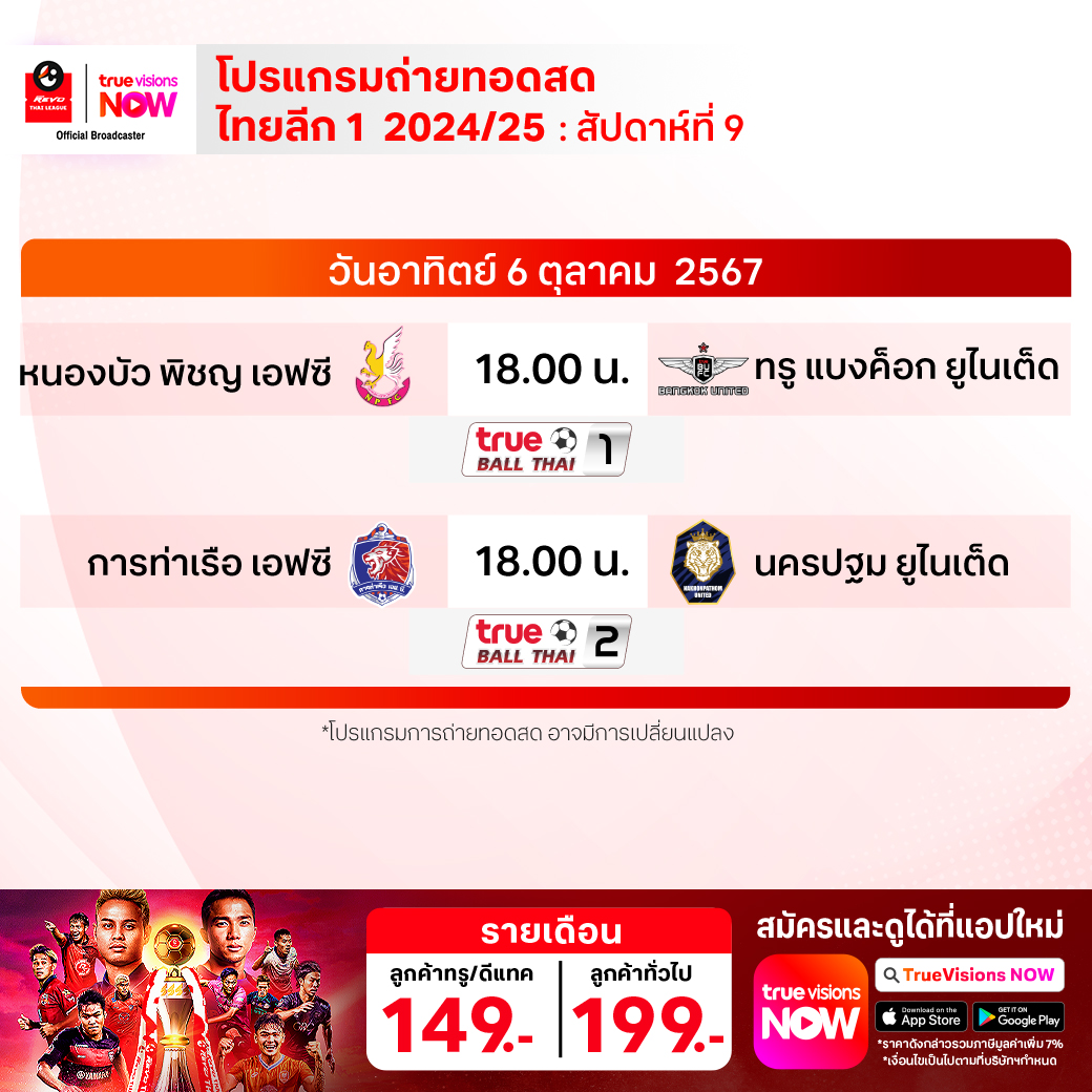 หนองบัว พิชญ เอฟซี พบ ทรู แบงค็อก ยูไนเต็ด เวลา 18.00-20.00 ทางช่อง True Ball Thai 1
