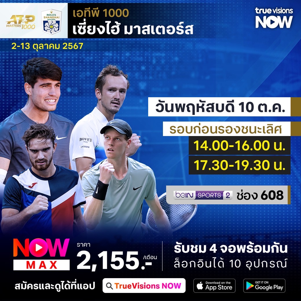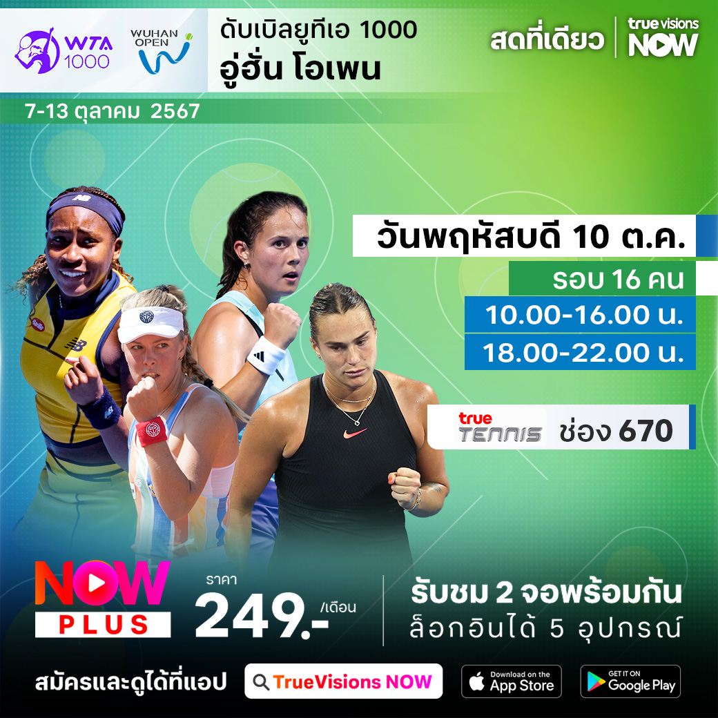 รอบ 16 คน เวลา 10.00 - 16.00 / 18.00 - 22.00 ทางช่อง True Tennis (670)