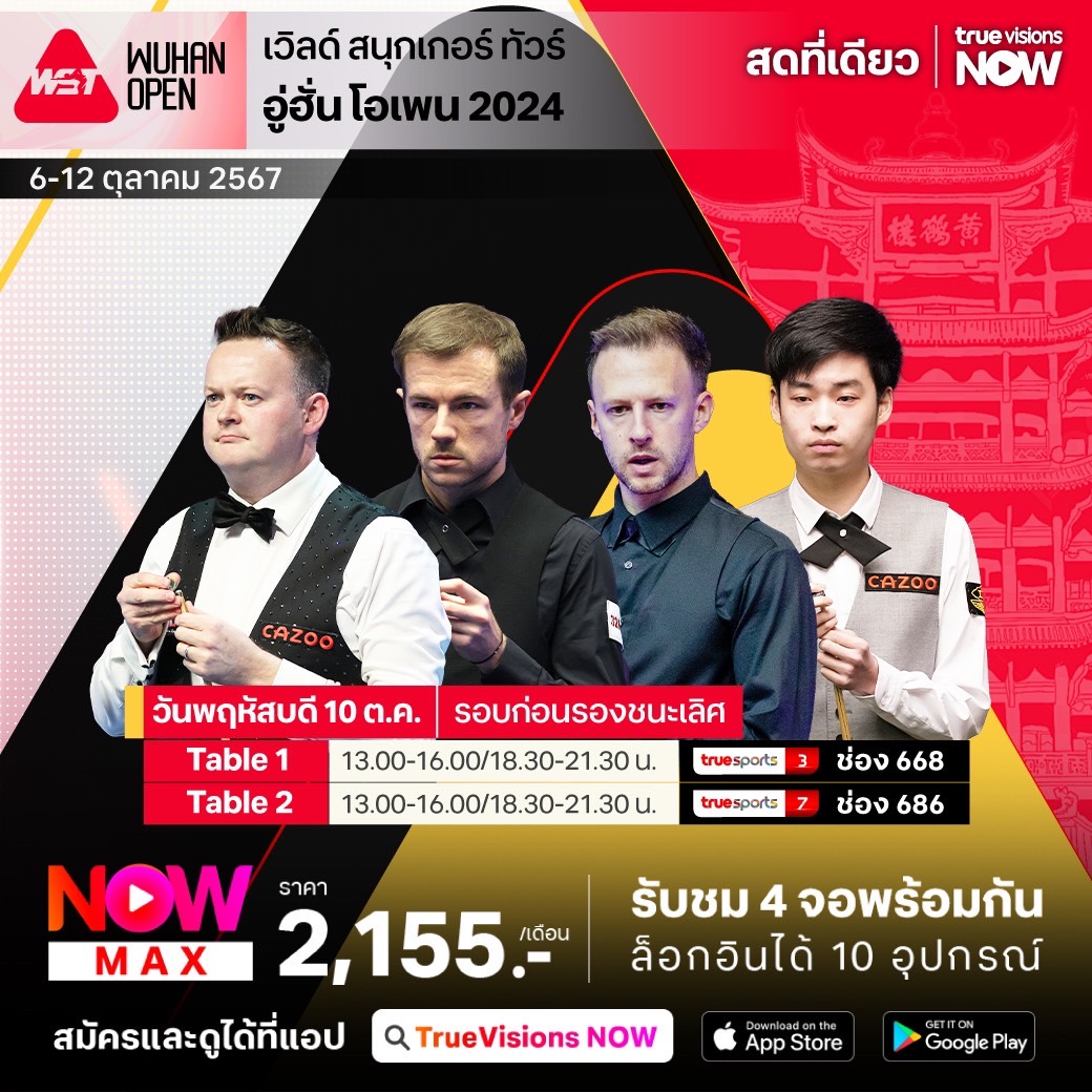 แฟนสนุกเกอร์ห้ามพลาด เมื่อเหล่าบรรดานักสอยคิวระดับเทพของวงการไปรวมตัวที่ประเทศจีนอีกครั้ง เพื่อร่วมทำศึกสำคัญในรายการเก็บคะแนนสะสมโลก อู่ฮั่น โอเพ่น 2024 ร่วมลุ้นกันว่า ใครจะคว้าแชมป์ไปครอง ชมสด เอ็กซ์คลูซีฟ ครบทุกรอบ ที่เดียว ที่ ทรูวิชั่นส์
