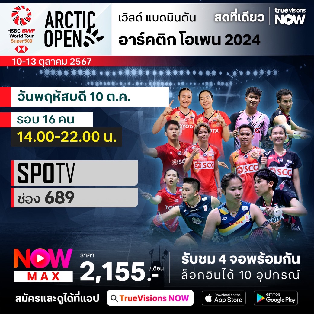 แฟนแบดมินตันพลาดไม่ได้ กับการแข่งขัน เวิลด์ แบดมินตัน รายการเก็บคะแนนสะสมโลกระดับ เวิลด์ ทัวร์ ซูเปอร์ 500 ในรายการ อาร์คติก โอเพ่น ที่ ประเทศฟินแลนด์ ร่วมเชียร์ทีมแบดมินตันไทย และตื่นตาตื่นใจกับลีลาและเทคนิคของมือระดับโลก ที่มีเป้าหมายคว้าชัยชนะและแย่งกันเป็นแชมป์ ชมสด เอ็กซ์คลูซีฟ ที่เดียวที่ ทรูวิชั่นส์