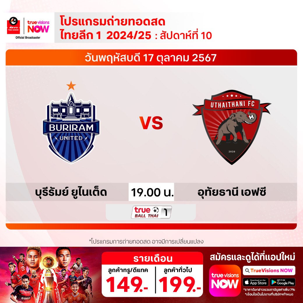 บุรีรัมย์ ยูไนเต็ด พบ อุทัยธานี เอฟซี เวลา 19.00-21.00 ทางช่อง True Ball Thai 1
