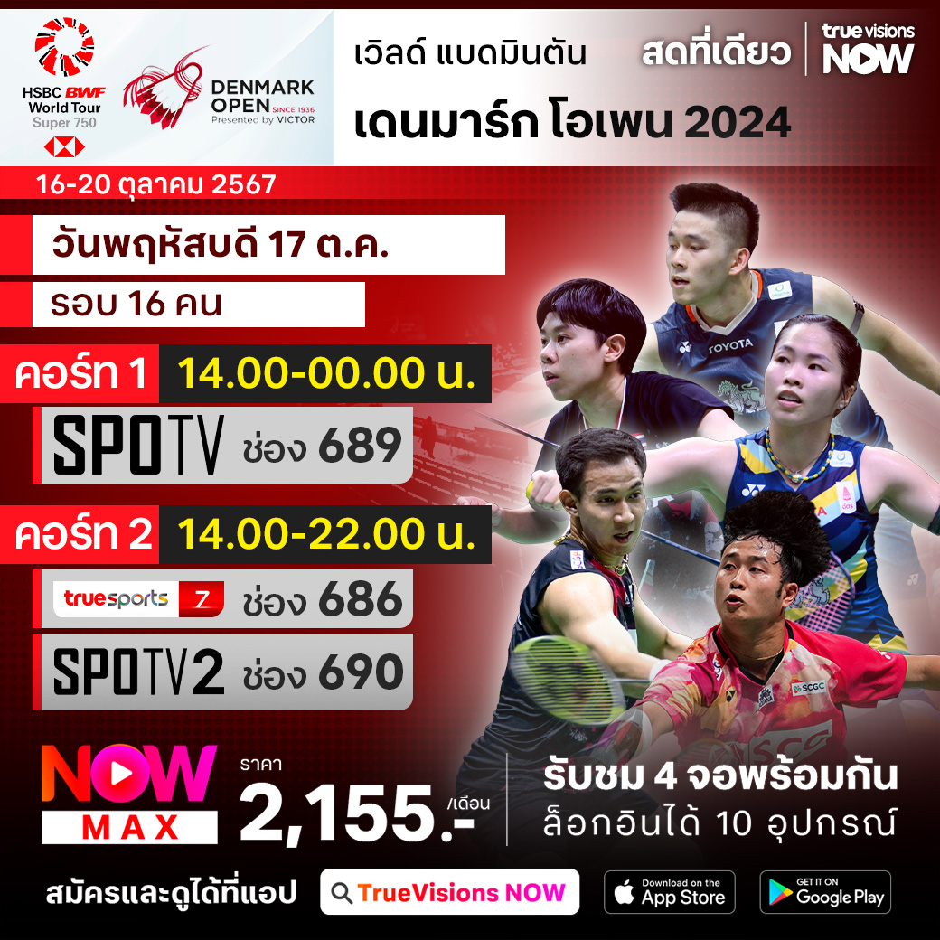 แบดมินตัน บีดับเบิ้ลยูเอฟ รายการ เดนมาร์ก โอเพ่น ที่เป็นรายการระดับ เวิลด์ ทัวร์ ซูเปอร์ 750 ที่เมืองโอเดนเซ่ ประเทศเดนมาร์ก ชิงเงินรางวัลรวมมากถึง 850,000 เหรียญสหรัฐฯ แฟนๆ จะได้เชียร์กันสุดเสียงกับผลงานของนักแบดมินตันไทย และ ตื่นตาตื่นใจกับลีลาของมือระดับโลก ชมสด เอ็กซ์คลูซีฟ ที่เดียวที่ ทรูวิชั่นส์