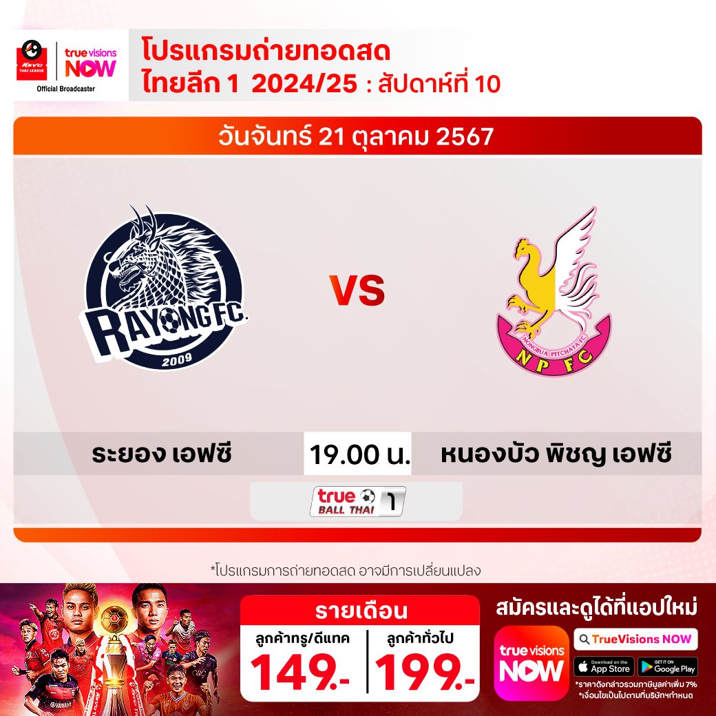 ระยอง เอฟซี พบ หนองบัว พิชญ เอฟซี เวลา 19.00-21.00 ทางช่อง True Ball Thai 1
