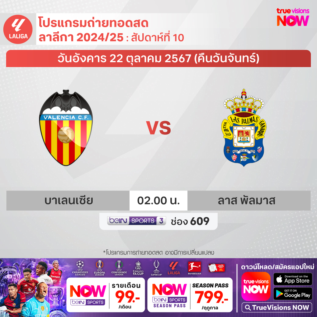 Valencia vs Las Palmas เวลา 02.00-04.00 ทางช่อง beIN 3 (609)