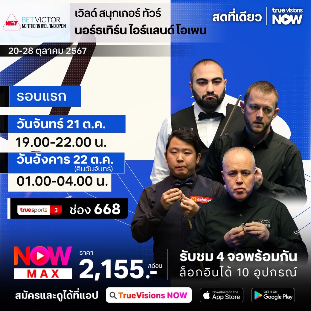 เวิลด์ สนุกเกอร์ ทัวร์ รายการ นอร์ธเทิร์น ไอร์แลนด์ โอเพ่น ที่เป็น 1 ใน 4 ของ โฮม เนชั่นส์ ซีรี่ส์ ที่สนามไทเทนิค เอ็กซิบิชั่น เซนเตอร์ ในกรุงเบลฟาสต์ ประเทศไอร์แลนด์เหนือ นำโดยแชมป์เก่าขวัญใจเจ้าถิ่นและมือ 1 ของโลกอย่าง จั๊ดด์ ทรัมป์ ร่วมชิงแชมป์ อเล็กซ์ ฮิกกิ้นส์ โทรฟี่ ชมสด เอ็กซ์คลูซีฟ ครบทุกรอบ ที่เดียวที่ ทรูวิชั่นส์
