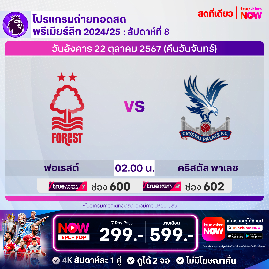 Nottingham Forest vs Crystal Palace เวลา 02:00 - 04:00 ทางช่อง TPF 1 (600) / TPF 2 (602)