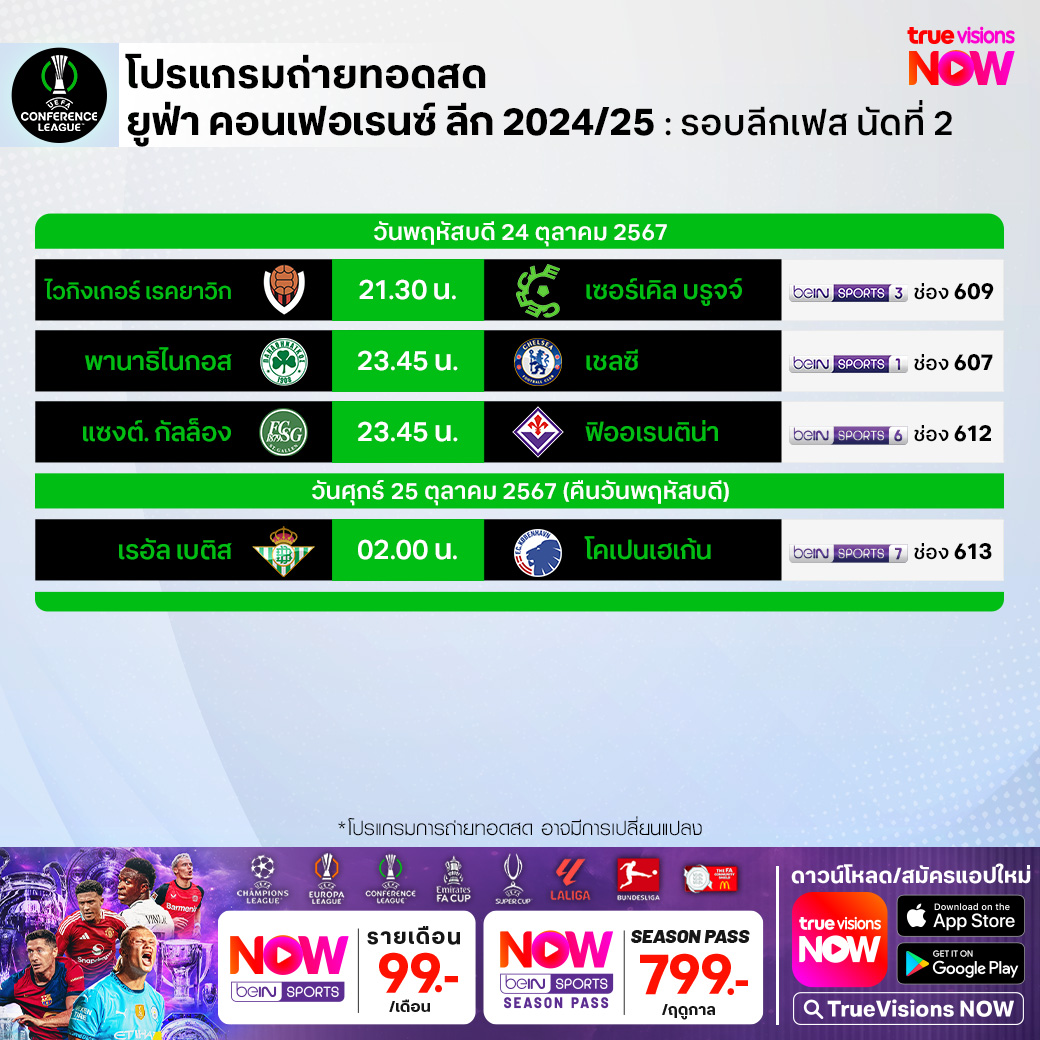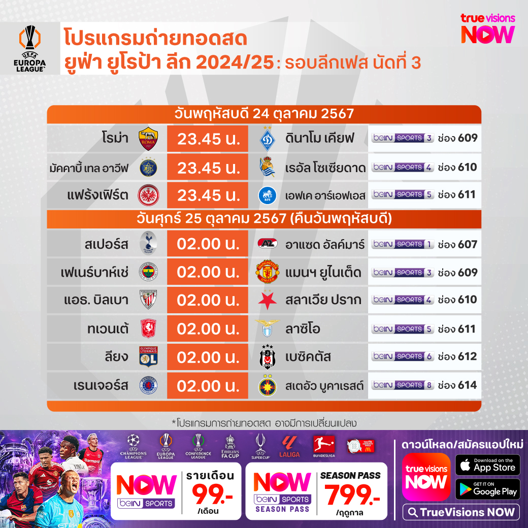 วันนี้มีอะไรดูที่ ทรูวิชั่นส์ ประจำวันพฤหัสบดีที่ 24 ตุลาคม 67 ยังคงมีกีฬาที่น่าสนใจให้ได้ตามลุ้นตามเชียร์กันเหมือนเดิม ในส่วนของฟุตบอลนั้นยังมีศึก ยูฟ่า ยูโรป้า ลีก และ ยูฟ่า คอนเฟอเรนซ์ ลีก รอบ ลีก เฟส ให้ได้ตามเชียร์กันต่อ ส่วนกีฬาอื่นๆ ยังมีเทนนิส เอทีพี ทัวร์ รายการ เวียนนา โอเพ่น, ดับเบิ้ลยูทีเอ ทัวร์ รายการ แพน แปซิฟิก โอเพ่น, กอล์ฟ พีจีเอ ทัวร์ รายการ โซโซ่ แชมเปี้ยนชิพ, ดีพี เวิลด์ ทัวร์ รายการ เจเนซิส แชมเปี้ยนชิพ, แอลพีจีเอ ทัวร์ รายการ เมย์แบงค์ แชมเปี้ยนชิพ, เวิลด์ สนุกเกอร์ ทัวร์ รายการ นอร์ธเทิร์น ไอร์แลนด์ โอเพ่น, บาสเกตบอลเอ็นบีเอ และอเมริกันฟุตบอลเอ็นเอฟแอล งานนี้ ทรูวิชั่นส์ จัดเต็มให้ชมกันถึงบ้าน