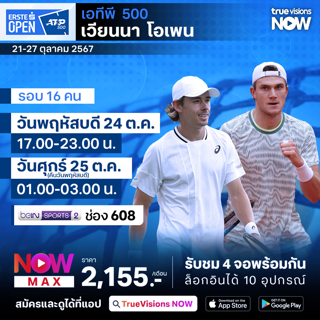 เทนนิสชายเข้าสู่ช่วงท้ายของฤดูกาล 2024 สัปดาห์นี้ไปกันที่กรุงเวียนนา ประเทศออสเตรีย กับรายการ เวียนนา โอเพ่น โดยจะเป็นรายการส่งท้ายอาชีพของ โดมินิค ธีม ยอดนักเทนนิสเจ้าถิ่น ที่จะเลิกเล่นหลังจากจบรายการนี้ และยังมีนักเทนนิสระดับโลกเข้าร่วมการแข่งขันอย่างคับคั่ง ร่วมลุ้นกันว่าใครจะคว้าแชมป์รายการนี้ไปครอง ชมสด ครบทุกรอบ ที่ ทรูวิชั่นส์