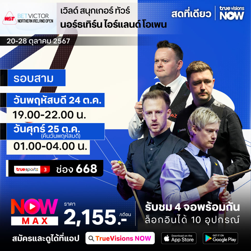 เวิลด์ สนุกเกอร์ ทัวร์ รายการ นอร์ธเทิร์น ไอร์แลนด์ โอเพ่น ที่เป็น 1 ใน 4 ของ โฮม เนชั่นส์ ซีรี่ส์ ที่สนามไทเทนิค เอ็กซิบิชั่น เซนเตอร์ ในกรุงเบลฟาสต์ ประเทศไอร์แลนด์เหนือ นำโดยแชมป์เก่าขวัญใจเจ้าถิ่นและมือ 1 ของโลกอย่าง จั๊ดด์ ทรัมป์ ร่วมชิงแชมป์ อเล็กซ์ ฮิกกิ้นส์ โทรฟี่ ชมสด เอ็กซ์คลูซีฟ ครบทุกรอบ ที่เดียวที่ ทรูวิชั่นส์