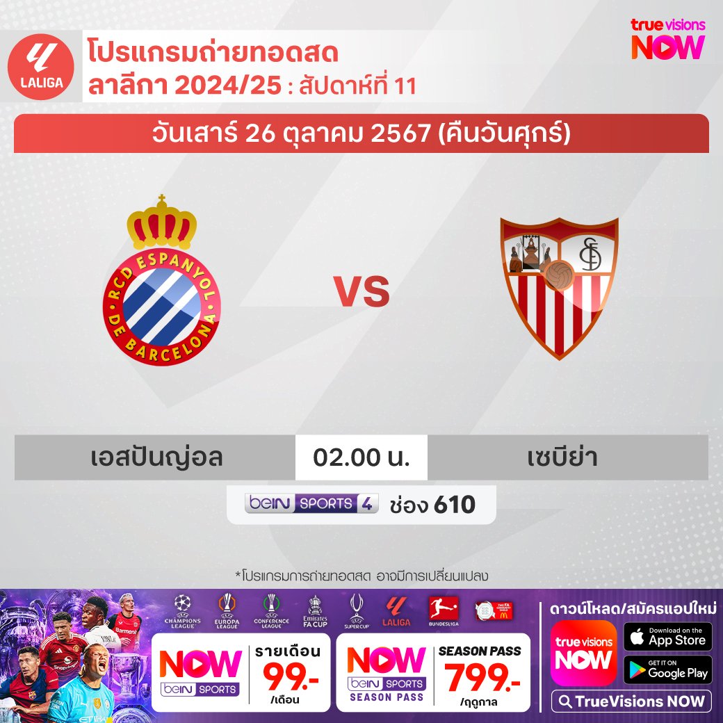 Espanyol vs Sevilla เวลา 02.00-04.00 ทางช่อง beIN 4 (610)
