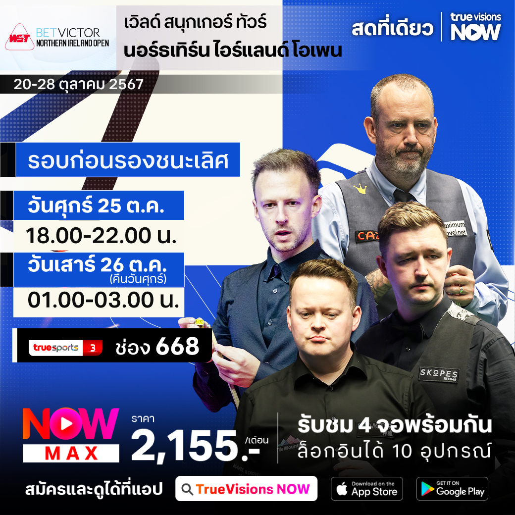 เวิลด์ สนุกเกอร์ ทัวร์ รายการ นอร์ธเทิร์น ไอร์แลนด์ โอเพ่น ที่เป็น 1 ใน 4 ของ โฮม เนชั่นส์ ซีรี่ส์ ที่สนามไทเทนิค เอ็กซิบิชั่น เซนเตอร์ ในกรุงเบลฟาสต์ ประเทศไอร์แลนด์เหนือ นำโดยแชมป์เก่าขวัญใจเจ้าถิ่นและมือ 1 ของโลกอย่าง จั๊ดด์ ทรัมป์ ร่วมชิงแชมป์ อเล็กซ์ ฮิกกิ้นส์ โทรฟี่ ชมสด เอ็กซ์คลูซีฟ ครบทุกรอบ ที่เดียวที่ ทรูวิชั่นส์
