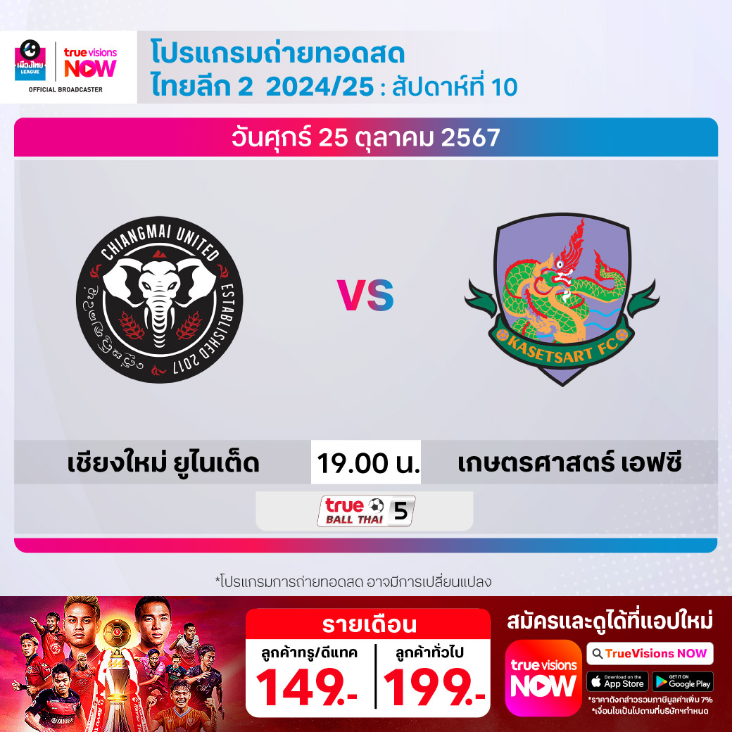 เชียงใหม่ ยูไนเต็ด พบ เกษตรศาสตร์ เอฟซี เวลา 19.00-21.00 ทางช่อง True Ball Thai 5