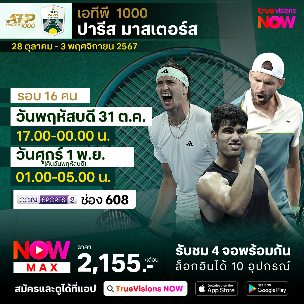 เทนนิส เอทีพี ทัวร์ สัปดาห์นี้ พบกับรายการระดับ เอทีพี 1000 รายการสุดท้ายของปี ปารีส มาสเตอร์ส ที่กรุงปารีส ประเทศฝรั่งเศส รวมนักเทนนิสระดับโลกเข้าแข่งขันกันอย่างครบครัน ทั้ง โนวัค ยอโควิช, คาร์ลอส อัลการาซ, ยานนิค ซินเนอร์ และนักเทนนิสระดับโลกอีกหลายคน ร่วมลุ้นกันว่าใครจะคว้าแชมป์เทนนิสรายการใหญ่ ระดับมาสเตอร์ 1000 รายการสุดท้ายของปีไปครอง ชมสด ครบทุกรอบ ที่ ทรูวิชั่นส์