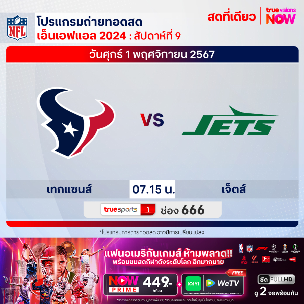 วันศุกร์ 1 พ.ย. Texans Vs Jets เวลา 07.15 ทางช่อง TS 1 (666)