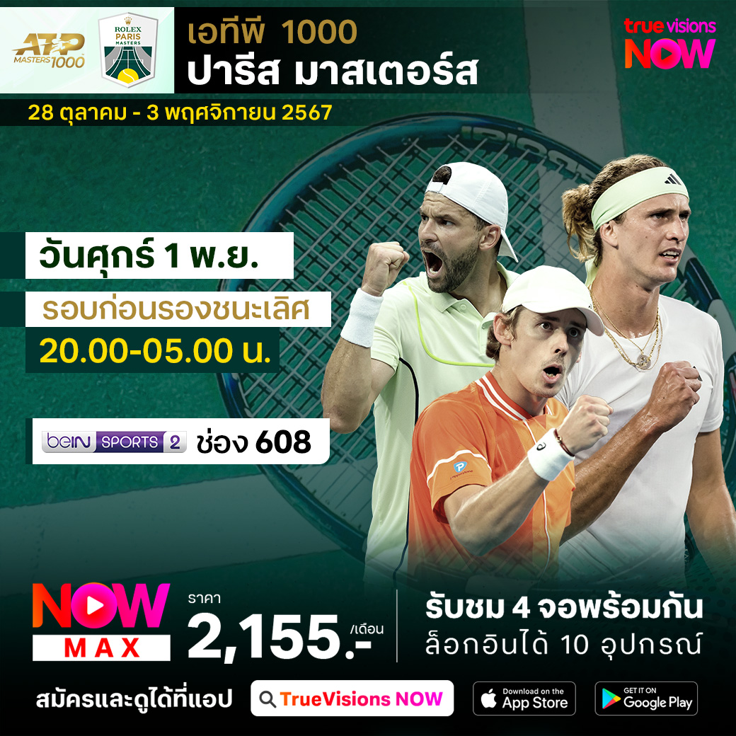 เทนนิส เอทีพี ทัวร์ สัปดาห์นี้ พบกับรายการระดับ เอทีพี 1000 รายการสุดท้ายของปี ปารีส มาสเตอร์ส ที่กรุงปารีส ประเทศฝรั่งเศส รวมนักเทนนิสระดับโลกเข้าแข่งขันกันอย่างครบครัน ทั้ง โนวัค ยอโควิช, คาร์ลอส อัลการาซ, ยานนิค ซินเนอร์ และนักเทนนิสระดับโลกอีกหลายคน ร่วมลุ้นกันว่าใครจะคว้าแชมป์เทนนิสรายการใหญ่ ระดับมาสเตอร์ 1000 รายการสุดท้ายของปีไปครอง ชมสด ครบทุกรอบ ที่ ทรูวิชั่นส์