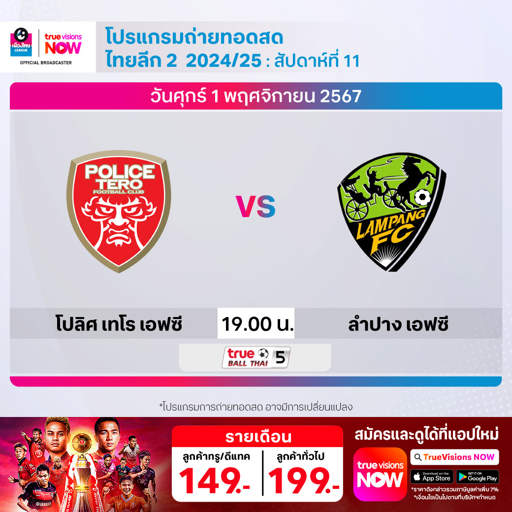 โปลิศ เทโร เอฟซี พบ ลำปาง เอฟซี เวลา 19.00-21.00 ทางช่อง True Ball Thai 5