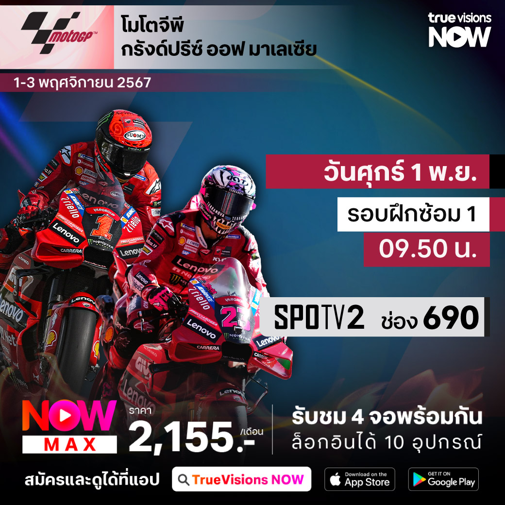 ศึกโมโต จีพี เวิลด์ แชมเปี้ยนชิพ สนามที่ 19 กับรายการ กรังด์ปรีซ์ ออฟ มาเลเซีย ที่สังเวียนสุดท้าทาย เซปัง อินเตอร์เนชั่นแนล เซอร์กิต กรุงกัวลาลัมเปอร์ ประเทศมาเลเซีย มันส์ครบทั้ง 3 รุ่นทั้ง โมโต 3, โมโต 2 ที่มี "ก้อง" สมเกียรติ จันทรา นักบิดหนึ่งเดียวของไทยให้ตามเชียร์ และรุ่นที่แฟนๆ ลุ้นกันสุดๆ อย่าง โมโต จีพี ติดตามกันสดๆ ทุกช่วงของการแข่งขัน ที่ทรูวิชั่นส์