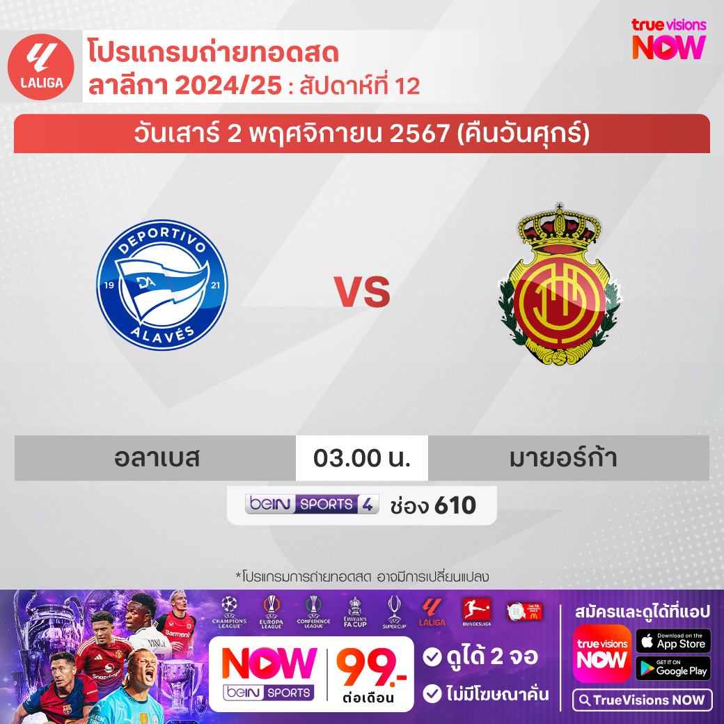 Alaves vs Mallorca เวลา 03.00-05.00 ทางช่อง beIN 4 (610)