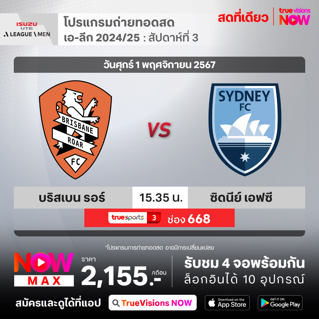 Brisbane Roar vs Sydney FC เวลา 15.35-17.35 ทางช่อง ทางช่อง TS 3 (668)