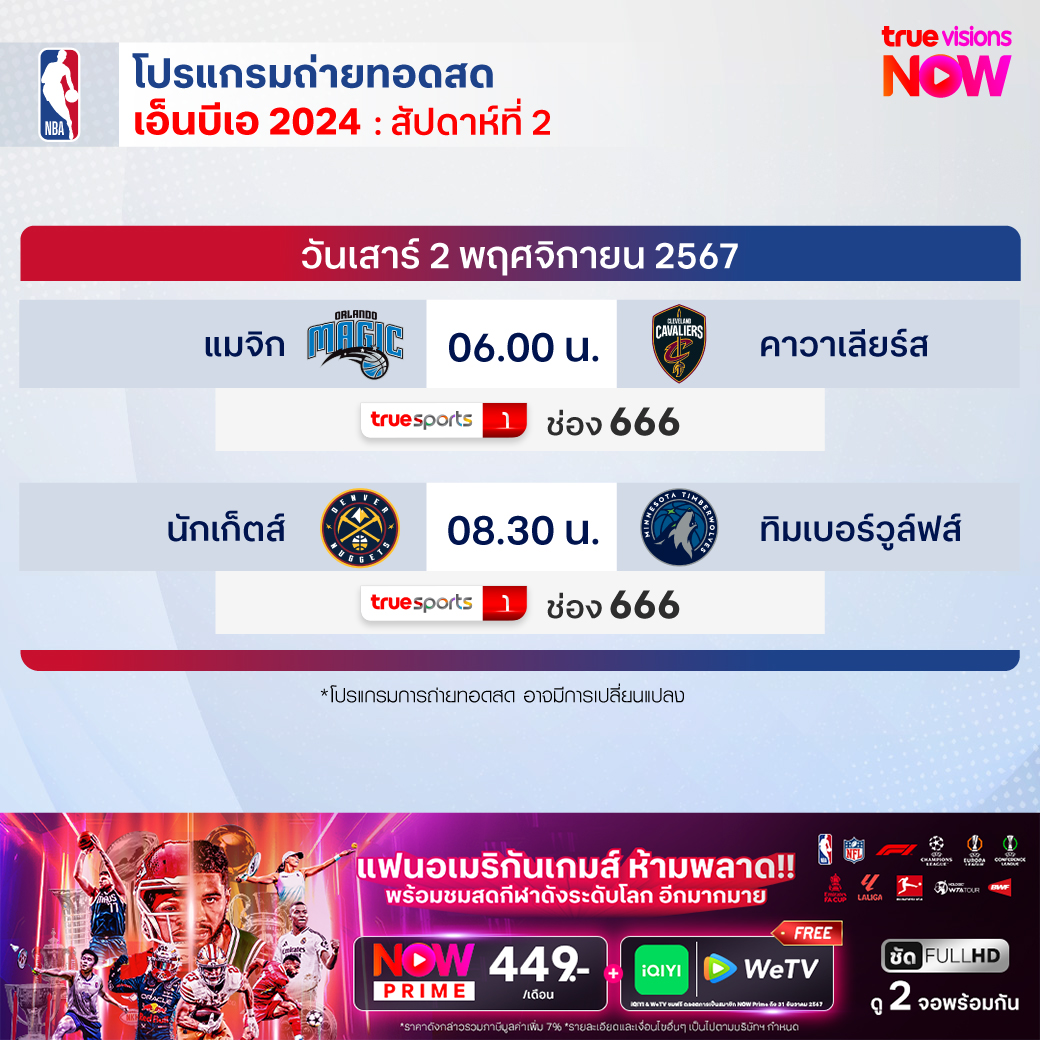 วันเสาร์ 2 พ.ย. Nuggets Vs Timberwolves เวลา 08.30 ทางช่อง TS 1 (666)