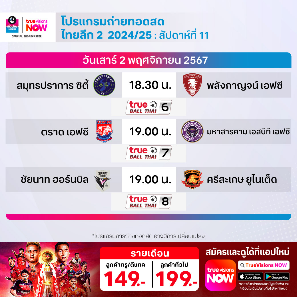 ตราด เอฟซี พบ มหาสารคาม เอสบีที เอฟซี เวลา 19.00-21.00 ทางช่อง True Ball Thai 7