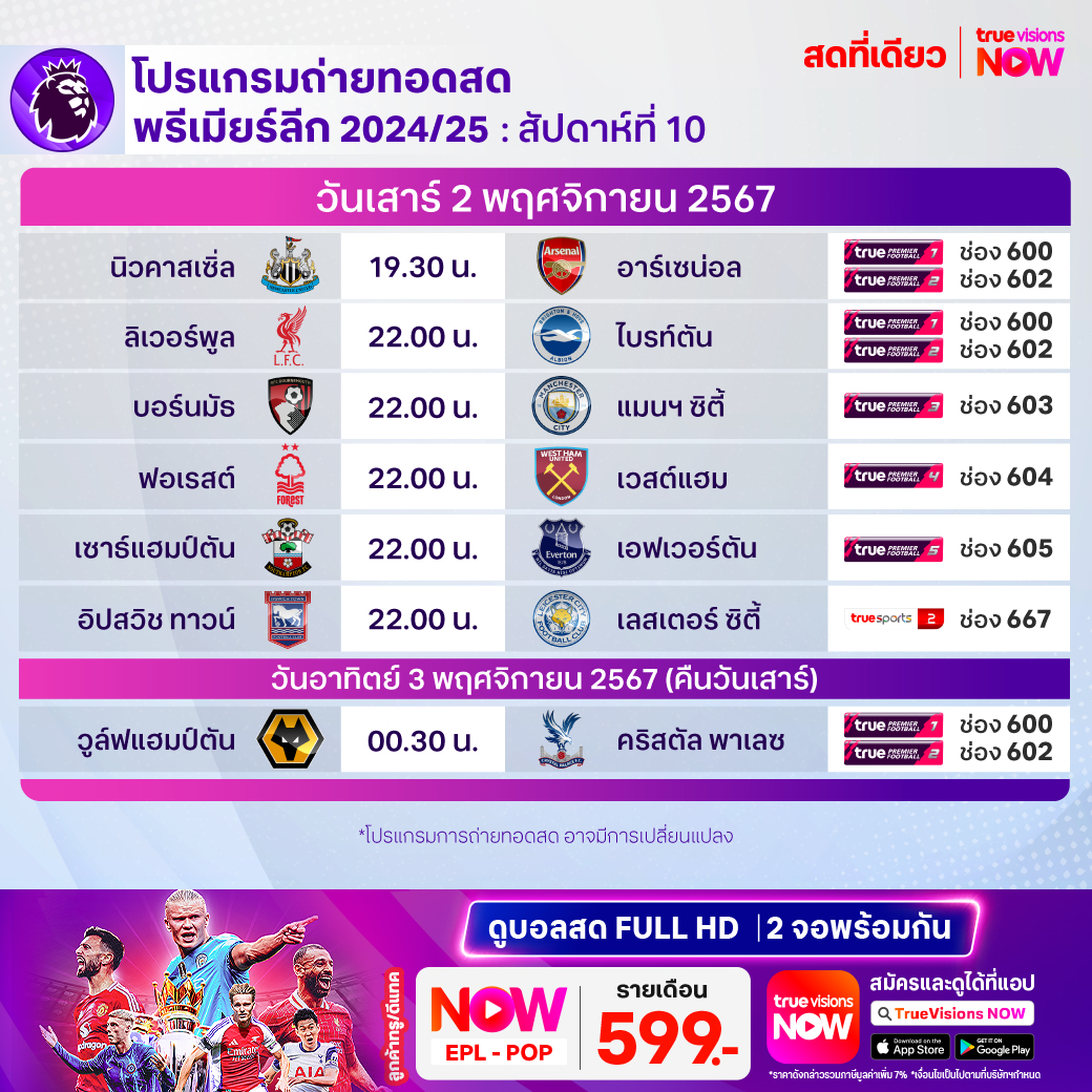 วันนี้มีอะไรดูที่ ทรูวิชั่นส์ ประจำวันเสาร์ที่ 2 พฤศจิกายน 67 ยังคงมีกีฬาที่น่าสนใจให้ได้ตามลุ้นตามเชียร์กันเหมือนเดิม ในส่วนของฟุตบอลนั้นยังมีศึกพรีเมียร์ลีก อังกฤษ, บุนเดสลีกา เยอรมนี, ลา ลีกา สเปน, เอ-ลีก ออสเตรเลีย, ซาอุดิ โปร ลีก และ ไทยลีก 1, 2 ให้ได้ตามเชียร์กันต่อ ส่วนกีฬาอื่นๆ ยังมีศึกฟอร์มูล่า วัน รายการ บราซิเลี่ยน กรังด์ปรีซ์, โมโต จีพี รายการ กรังด์ปรีซ์ ออฟ มาเลเซีย, เทนนิส เอทีพี ทัวร์ รายการใหญ่ ปารีส มาสเตอร์ส, บาสเกตบอลเอ็นบีเอ และกีฬาที่น่าสนใจอีกมากมาย งานนี้ ทรูวิชั่นส์ จัดเต็มให้ชมกันถึงบ้าน
