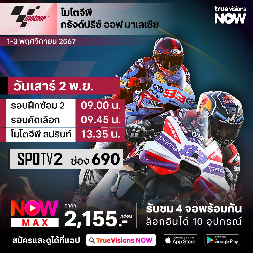 ศึกโมโต จีพี เวิลด์ แชมเปี้ยนชิพ สนามที่ 19 กับรายการ กรังด์ปรีซ์ ออฟ มาเลเซีย ที่สังเวียนสุดท้าทาย เซปัง อินเตอร์เนชั่นแนล เซอร์กิต กรุงกัวลาลัมเปอร์ ประเทศมาเลเซีย มันส์ครบทั้ง 3 รุ่นทั้ง โมโต 3, โมโต 2 ที่มี "ก้อง" สมเกียรติ จันทรา นักบิดหนึ่งเดียวของไทยให้ตามเชียร์ และรุ่นที่แฟนๆ ลุ้นกันสุดๆ อย่าง โมโต จีพี ติดตามกันสดๆ ทุกช่วงของการแข่งขัน ที่ทรูวิชั่นส์