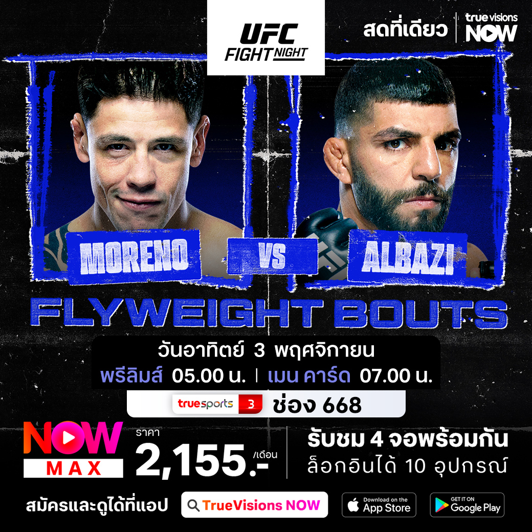 ยูเอฟซี ไฟต์ ไนท์ สัปดาห์นี้ ขึ้นเหนือไปที่สังเวียน โรเจอร์ส เพลส เมืองเอ็ดมันด์ตัน ประเทศแคนาดา คู่เอก อดีตแชมป์ชาวเม็กซิกัน แบรนดอน โมเรโน่ ฐานะรองแชมป์ อันดับ 2 ปะทะคู่ชกสุดแกร่งจากอิรัก เอเมียร์ อัลบาซี่ ร่วมด้วยรุ่นฟลายเวตหญิง เอริน บลานช์ฟิลด์ พบอดีตแชมป์ โรส นามายูนัส ชมสด เอ็กซ์คลูซีฟ ทั้งรอบ พรีลิมส์ และ เมน คาร์ด ที่ทรูวิชั่นส์