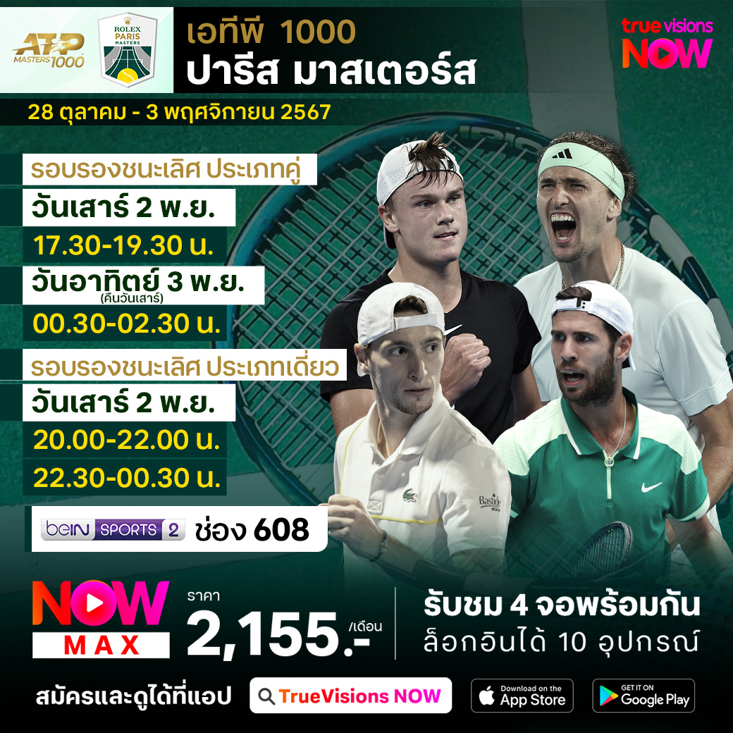 เทนนิส เอทีพี ทัวร์ สัปดาห์นี้ พบกับรายการระดับ เอทีพี 1000 รายการสุดท้ายของปี ปารีส มาสเตอร์ส ที่กรุงปารีส ประเทศฝรั่งเศส รวมนักเทนนิสระดับโลกเข้าแข่งขันกันอย่างครบครัน ทั้ง โนวัค ยอโควิช, คาร์ลอส อัลการาซ, ยานนิค ซินเนอร์ และนักเทนนิสระดับโลกอีกหลายคน ร่วมลุ้นกันว่าใครจะคว้าแชมป์เทนนิสรายการใหญ่ ระดับมาสเตอร์ 1000 รายการสุดท้ายของปีไปครอง ชมสด ครบทุกรอบ ที่ ทรูวิชั่นส์