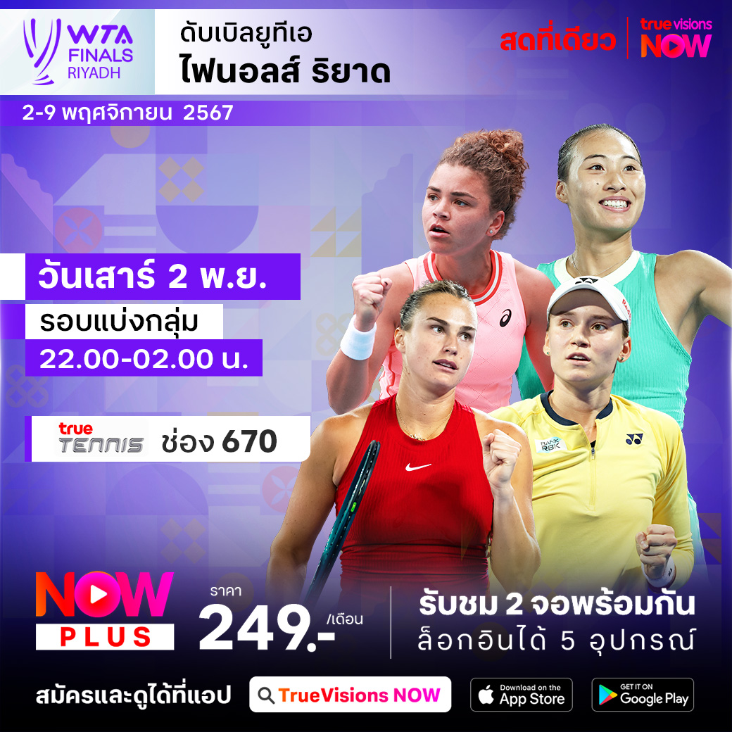 เทนนิสหญิง ดับเบิ้ลยูทีเอ ทัวร์ เข้าสู่ช่วงท้ายของฤดูกาล กับรายการที่รวมสุดยอดผู้เล่น 8 คนที่มีคะแนนสะสมในปี 2024 ที่สูงที่สุด ในรายการ ดับเบิ้ลยูทีเอ ไฟนอลส์ ที่กรุงริยาด ประเทศซาอุดิอาระเบีย ร่วมลุ้นกันว่าใครจะเป็นที่สุดของนักเทนนิสหญิงประจำปี 2024 ชมสด ครบทุกรอบ ที่ ทรูวิชั่นส์