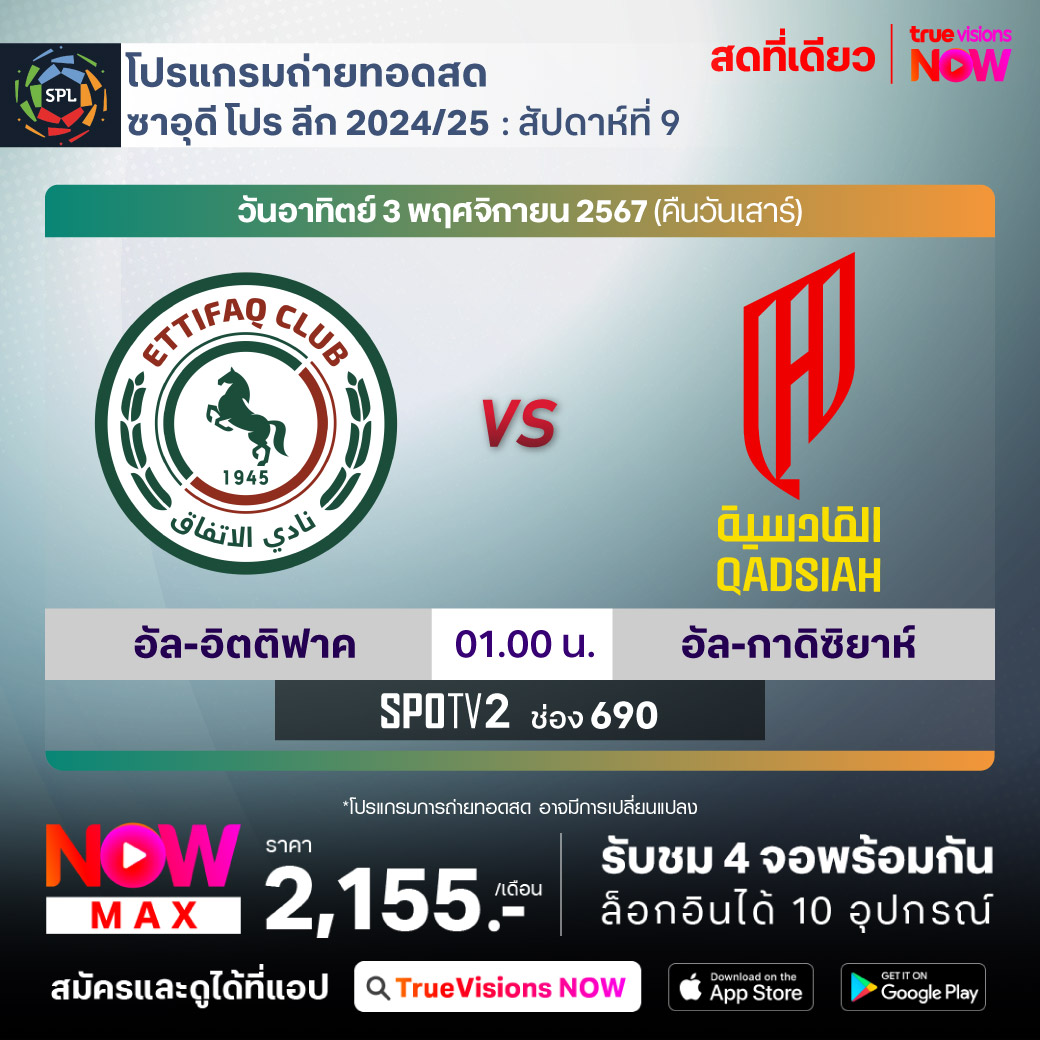 Al-Ettifaq vs Al-Qadisiyah เวลา 01.00-03.00 ทางช่อง SPOTV2 (690)